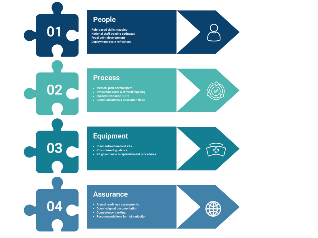 Our year-round partnership programme combines UK-accredited trauma training, medical planning support, and structured readiness reviews to ensure your teams can respond effectively when systems fail. Designed for companies operating in high-risk, remote, or limited-infrastructure environments, the partnership strengthens duty of care, improves field resilience, and creates sustainable internal capability.