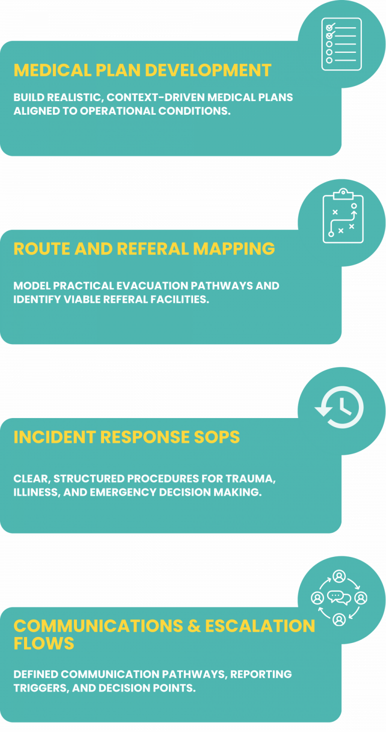 Our year-round partnership programme combines UK-accredited trauma training, medical planning support, and structured readiness reviews to ensure your teams can respond effectively when systems fail. Designed for companies operating in high-risk, remote, or limited-infrastructure environments, the partnership strengthens duty of care, improves field resilience, and creates sustainable internal capability.