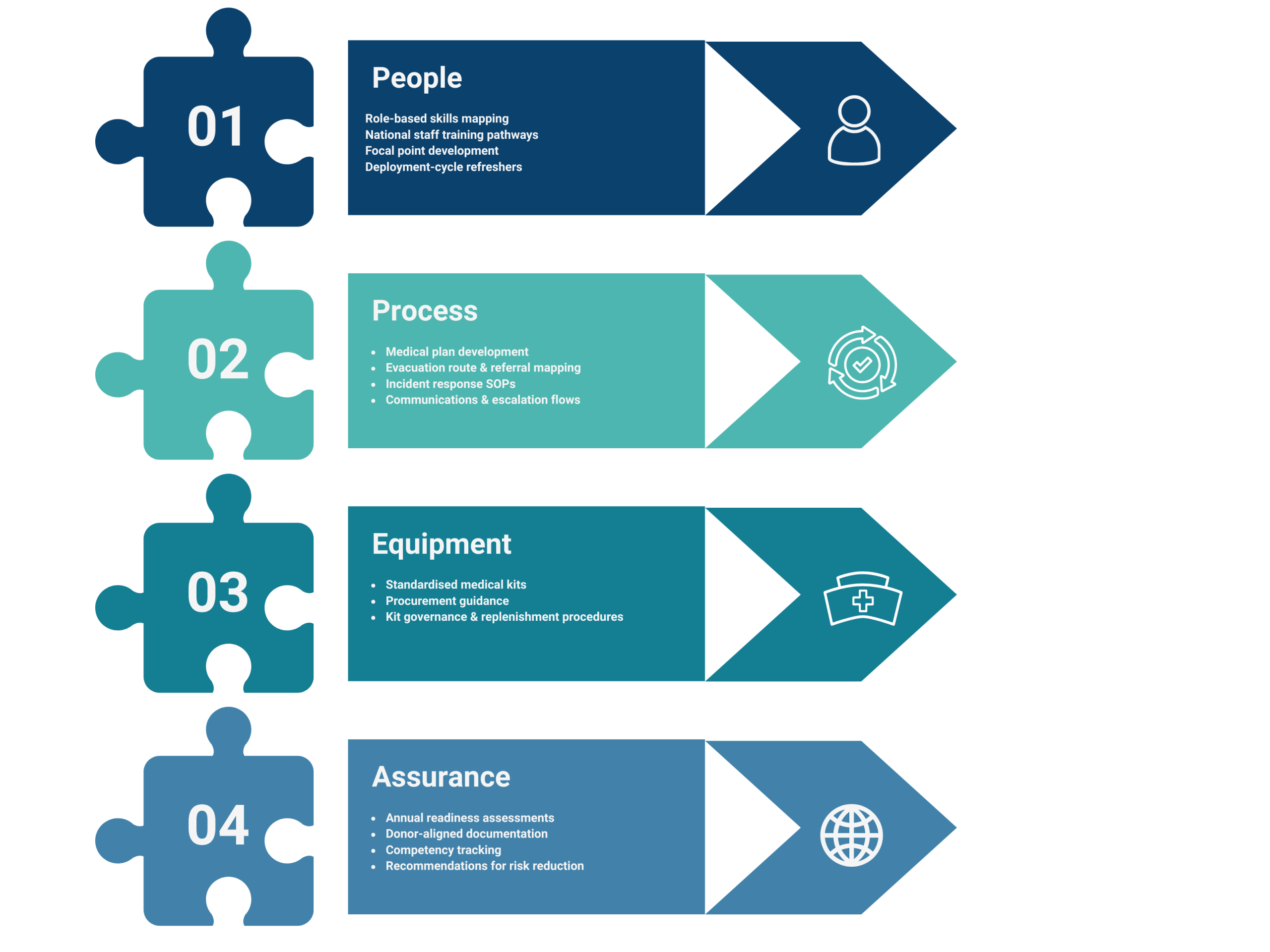 Humanitarian operations across the Middle East face complex challenges — delayed evacuation, fragmented medical infrastructure, remote field locations, and high operational tempo. The Integrated Medical Readiness Partnership helps organisations strengthen their internal medical capability through a balanced model that combines organisational systems development with clinically governed trauma training.